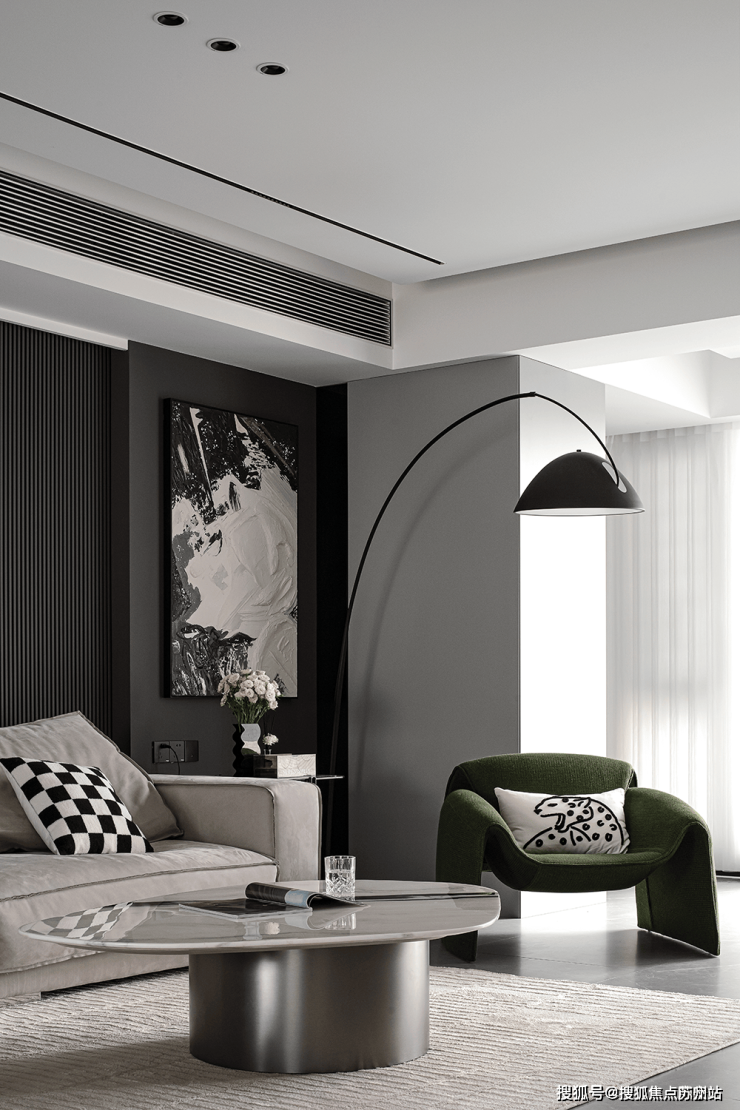 空间布局重新打造,传统设计的隔断被拆除,通透感中,各区域联系更紧密。黑色沙发奇特的造型带来动感和时尚元素,沙发上有凸起设计,提高支撑感,让居者小憩时更加舒适,体会时光温柔。