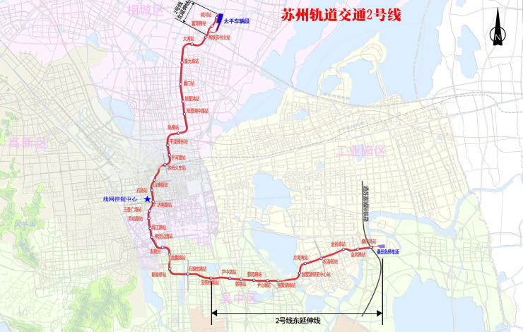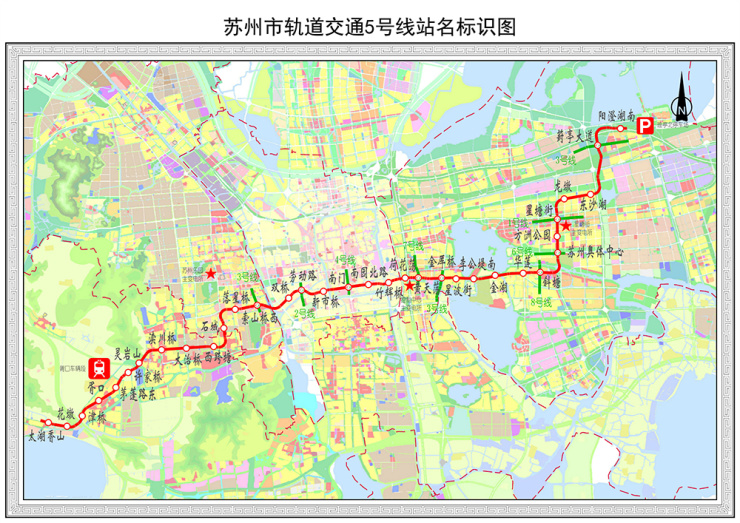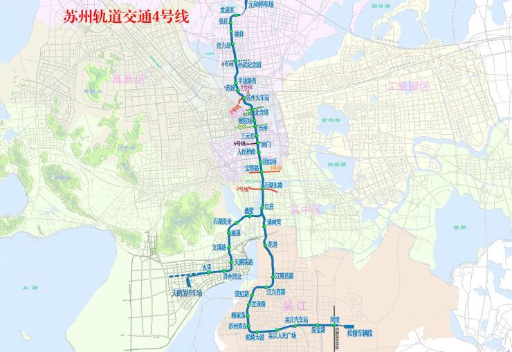 苏州地铁5号线正在建设中,预计明年6月开通试运营,标志色为品红色。线路起于吴中区的太湖香山站,止于苏州工业园区的阳澄湖南站,跨越吴中区、高新区、姑苏区、园区,规划如下图。
