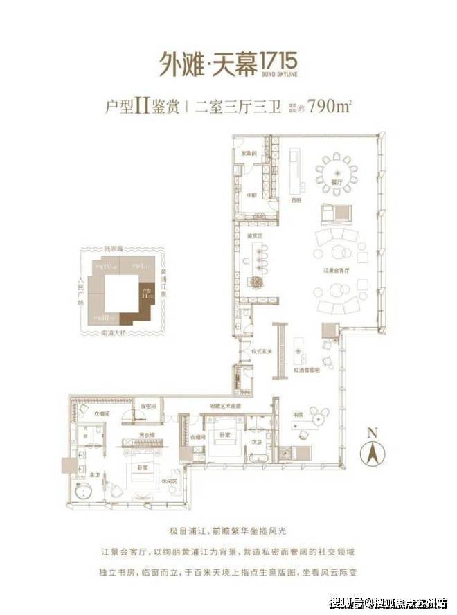 上海黄浦外滩·天幕1715售楼处电话☎:400-8123-664(售楼处预约看房热线)270°面南向大宽厅,南北通透,光景绝佳.开敞视野自成气度,雍容舒展,窗内、窗外皆可作“景”,内敛深刻中畅贯优雅情调自然延伸.