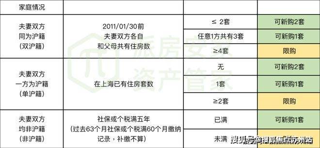 非上海户籍家庭,一方社保或者个税满5年,可购买一套。满5年社保或满5年个税是指签合同当月,往前推算63个月社保或个税正常缴纳满60个月。