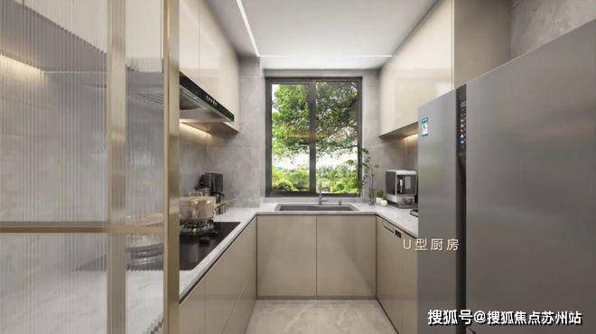 虹桥润璟厨房U型操作台面,操作空间充裕;更值得点赞的是预留了双开门冰箱位置,你要知道普通百平米三房,基本只预留单体冰箱的空间。