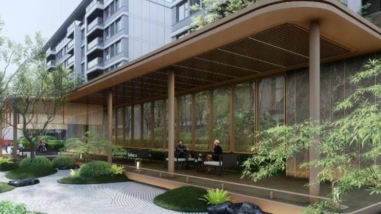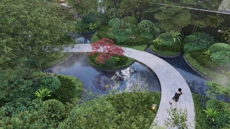 项目整体以摩登东方为核心造景理念,营造一环两轴N组团的景观布局,将花草、树木、流水、山石、景墙编织成序曲语言,在浮躁与喧嚣的城市中,用宁静温润的语言将摩登东方的惬意美好娓娓道来。