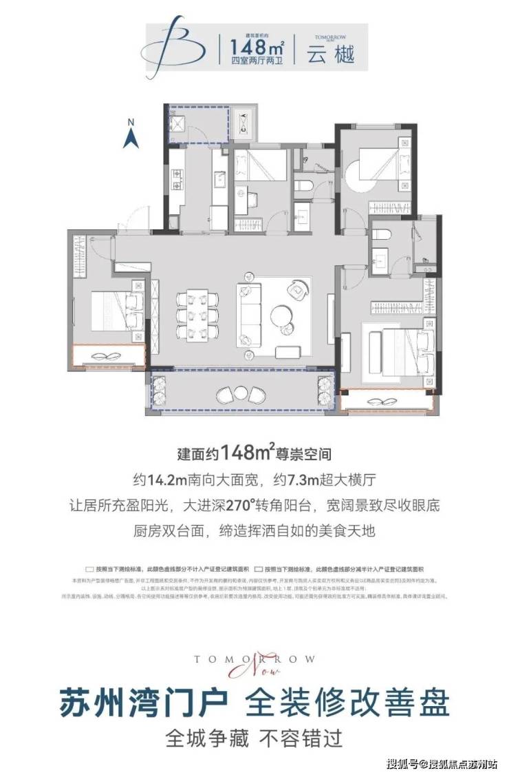 约7.3米大横厅 (148㎡户型),构筑灵动自由的奢享空间,满足80%的家庭休闲时光;科学合理的动线规划,全装修交付,更是洞察现代人居之后的设计,为高净值人士提供细致入微的品质感生活体验,以达成各种宜居的可能性,征服苏州的挑剔眼光