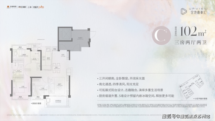 以及我们的网红爆款,建面约102㎡(C户型)三房两厅两卫,不仅保留了其小户型所有的优势,更增强了空间感和舒适度!