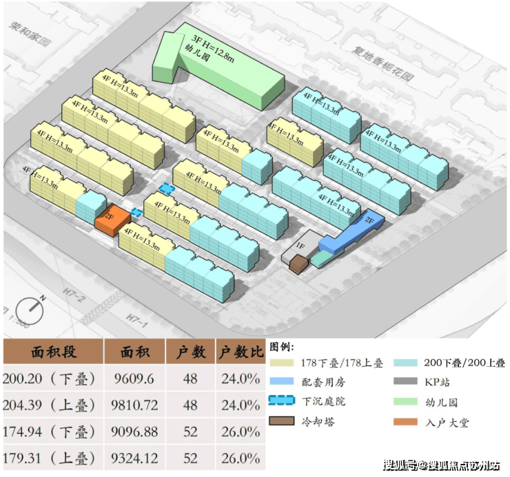 该地块拟建设13幢4F叠加别墅,容积率1.29,占地面积29895.54㎡,总计容面积38565.24㎡,限高18米,共计200套。中小套型、住宅套数下限无设定,保障房配建比例为0%,装修标准5000元/㎡。