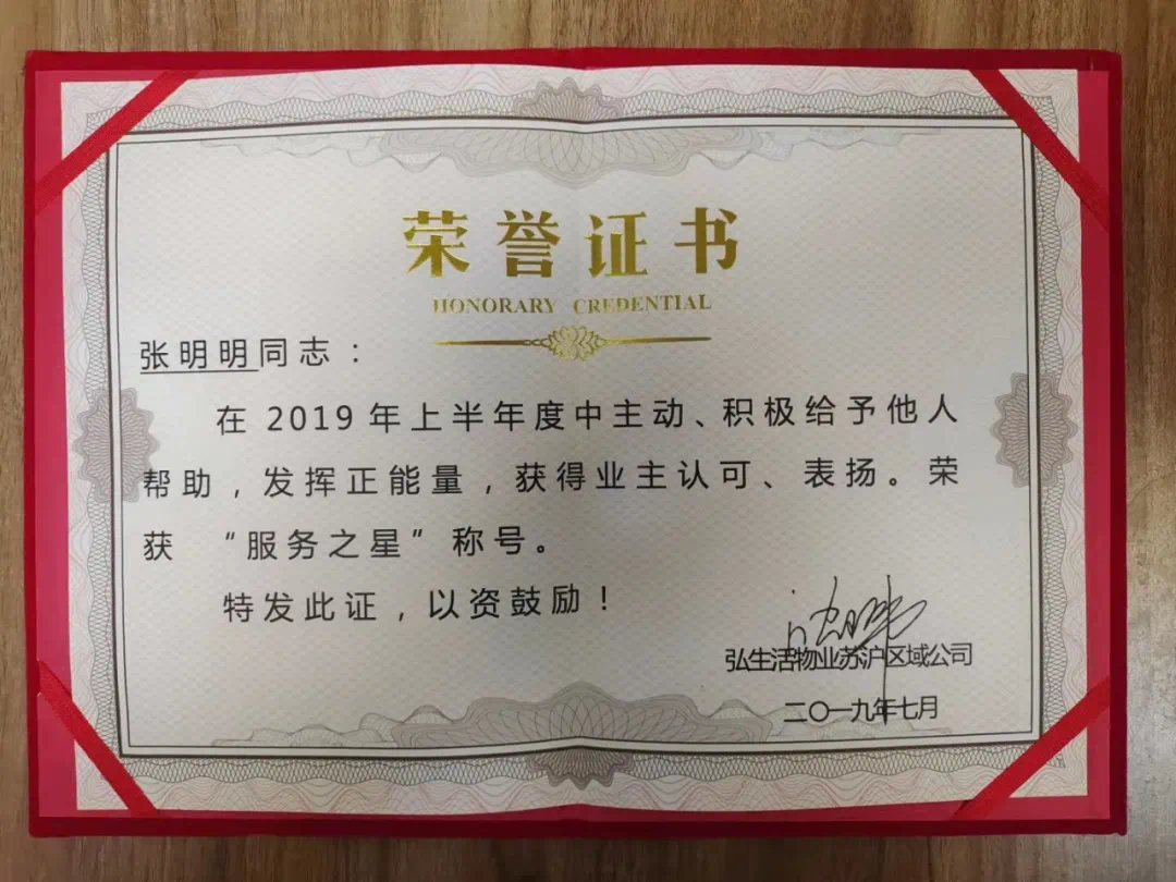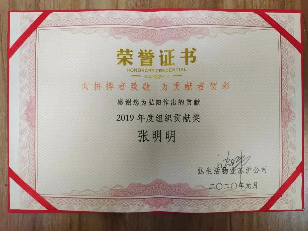 据悉,早在2019年7月, 张明明因工作中主动、积极给予他人帮助,发挥正能量,广获业主认可,荣获弘阳“服务之星”的称号,并在年底获得“2019年度组织贡献奖”。