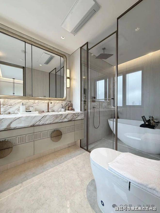 尤其主卧星级套房,配置独立衣帽间、书房,奢华主卫四分离,双台盆+淋浴区+大浴缸+智能马桶,私密性&奢适度无敌;