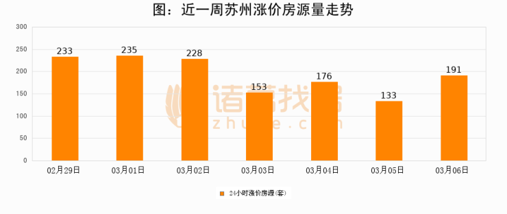 根据诸葛找房数据显示,苏州24小时涨价房源量为191套,较03月05日增加58套,环比上涨43.6%。与此同时,涨价房源占比小幅扩大,业主信心有所提升。