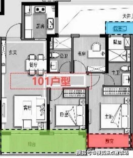 高层101平米:三房两厅两卫,南北通透,同面积段板块唯一6.3m双阳台,户型方正,90cm宽景飘窗,低总价,实用性更高;