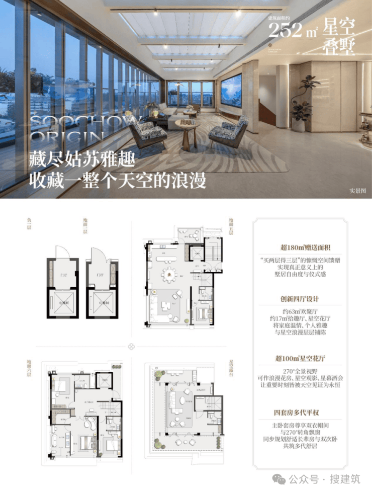 星空花厅创新:超100㎡顶层空间,搭配270°全景视野,突破传统屋顶局限,创造星空下的浪漫生活场景.