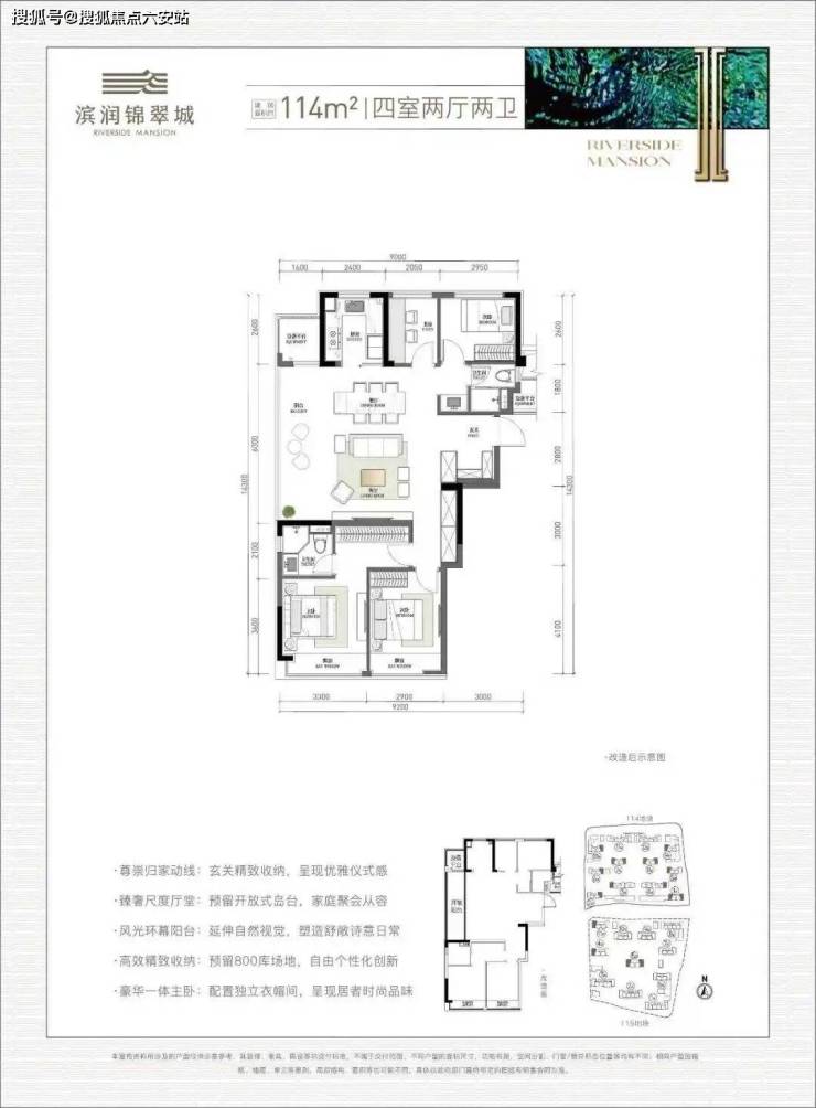 改善边套户型:建面约114方四房两卫,拥有独立入户玄关、客餐厅+封包阳台、南向主卧套房+次卧……4房功能一步到位。