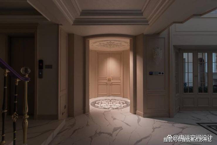 柔和的光线从顶部洒下,照亮带有精美花纹的圆形地砖,它与顶部雕花形成共鸣,于一明一暗间,塑造出入户门厅精致、高级的气质。这里是家的第一道风景,也是法式优雅的初次邂逅,仿佛在轻声诉说着:“欢迎来到浪漫的殿堂。”