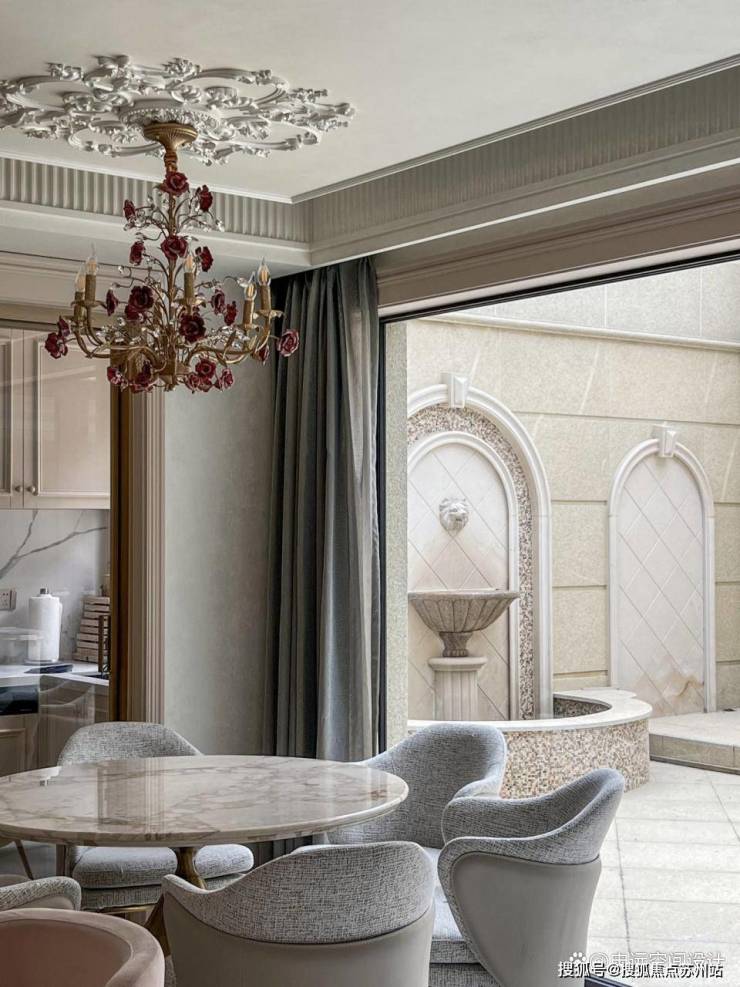 大幅落地窗,将室外下沉式花园景致引入室内,石质喷泉与墙面拱形装饰相映成趣,而绽放的花朵吊灯,为餐厅增添了浓郁的艺术气息和浪漫格调。