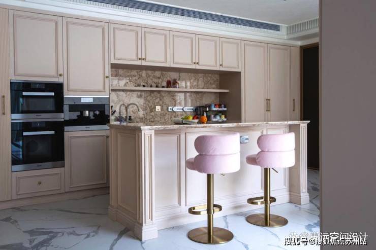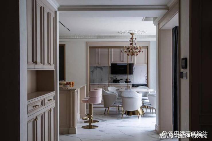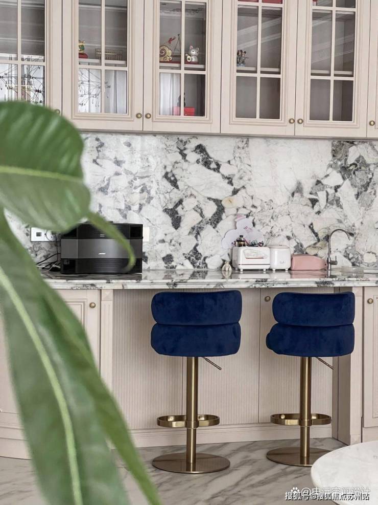 右侧的水吧台,以黑白纹理的大理石搭配木质收纳柜和蓝色绒面金属腿高脚凳。悄然探入的绿植,如灵动音符,流淌出惬意。申远设计师通过对细节的雕琢,将法式轻奢风格的精髓融入每一处空间。