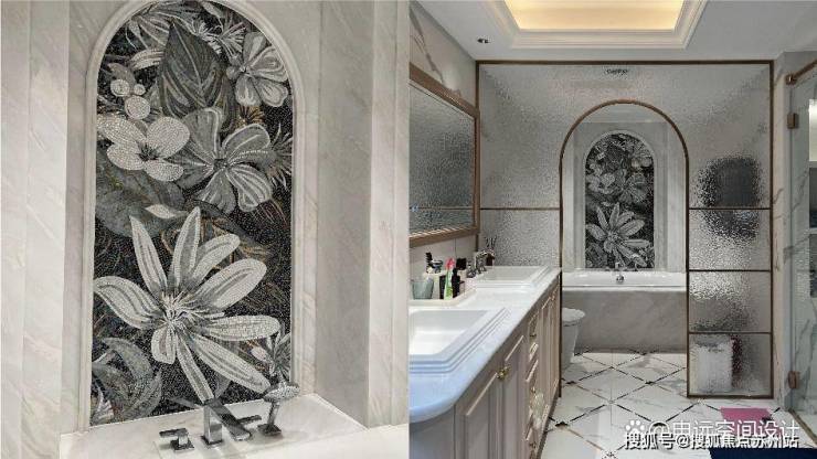 大理石随性自然的纹理与菱格元素的叠序设计碰撞出卫生间独特的艺术美感。申远设计师巧妙加入采光天井,让自然光线倾泻而下,同时以马赛克与石材精心打造花卉背景墙,营造出一个既个性十足又充满浪漫气息的私密空间。