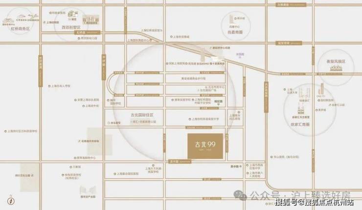 1-1.5公里步行圈:古北1699广场、黄金城道步行街、高岛屋、古北市民中心、体汇+名都体育公园、虹桥高尔夫球场、古北SOHO、程十发美术馆;2.5-3.5公里生活/商务圈:尚嘉中心、南丰城、老外街、世贸商城、徐家汇恒隆、新鸿基ITC、爱琴海购物中心、万象城、仙霞网球中心、西郊宾馆、虹桥迎宾馆、漕河泾开发区;