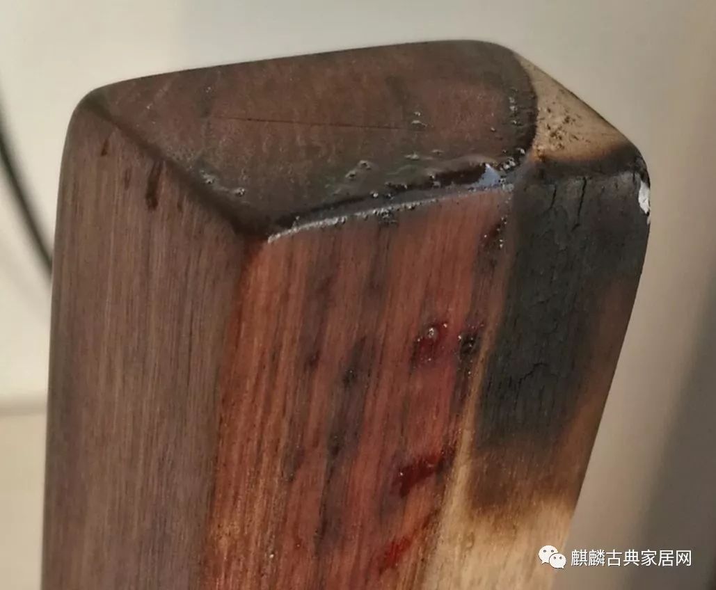 为了检测螺穗木的油性,麒麟网小编用打火机对木样进行烧烤实验。实验中可以看到,烧烤心材时,几秒钟后,大量的油脂从横截面处滋啦滋啦地冒出,同时在纵切面上可以看到少量油脂渗出。而边材则没有油脂渗出。由此可见,螺穗木心材的油性非常足。实验油性表现参见下图。