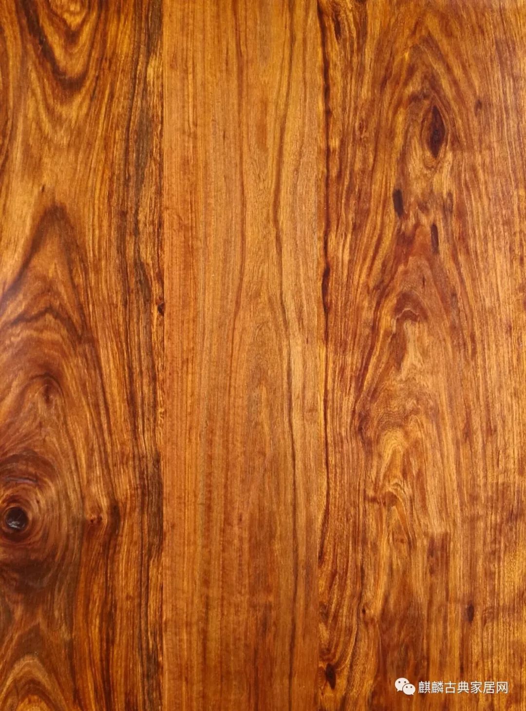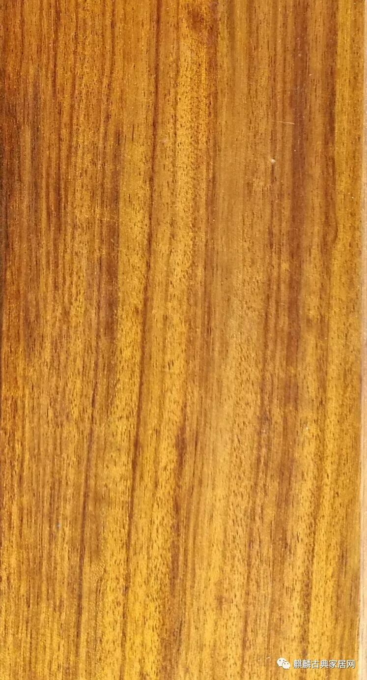 木材纵切面基本是直纹,偶尔可以看到绸缎纹、虎皮纹,类似花梨木中的虎皮纹,但在条纹的间隔规律上较不规则,颜色也稍淡,在灯光照射下经常可泛荧光,参见下图中的生漆和打蜡两个木样。