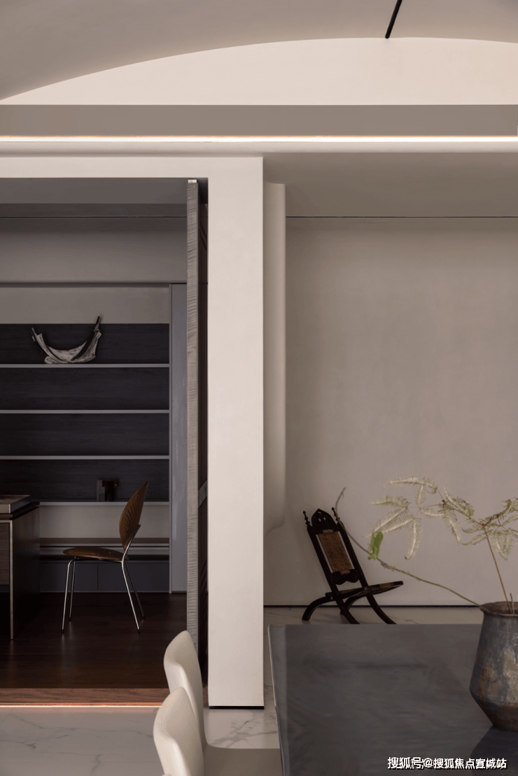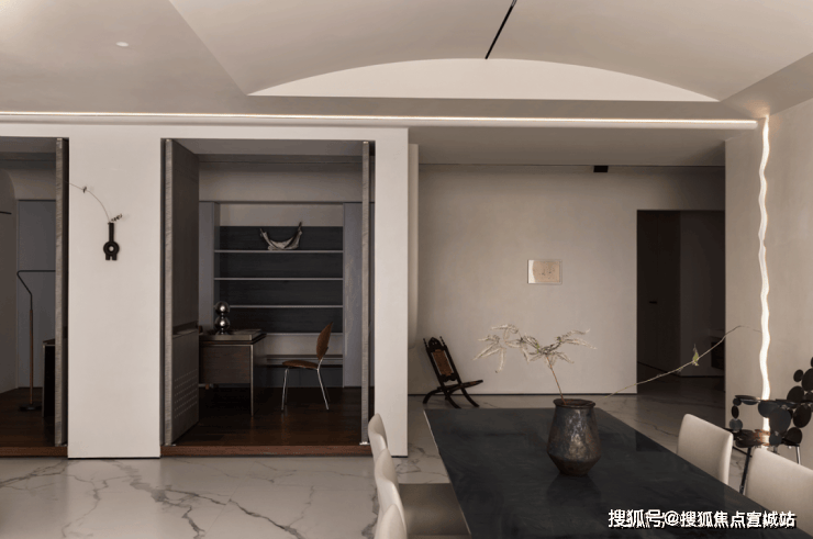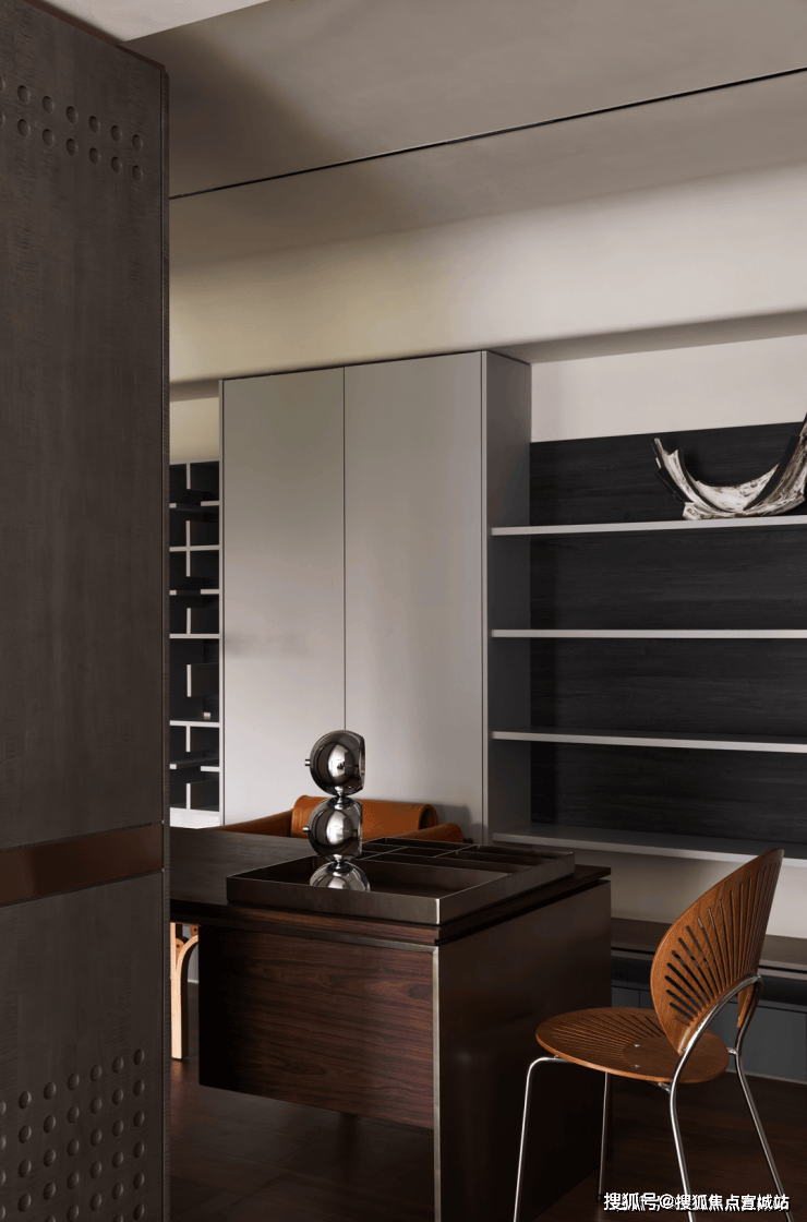 如果说餐厨是一家人的阳光与热闹,那么书房就是一个人的沉浸与关照。设计师借由光引导空间和情绪转折,通过隔断、错落等手法,演绎动与静,功能与艺术的平衡美。