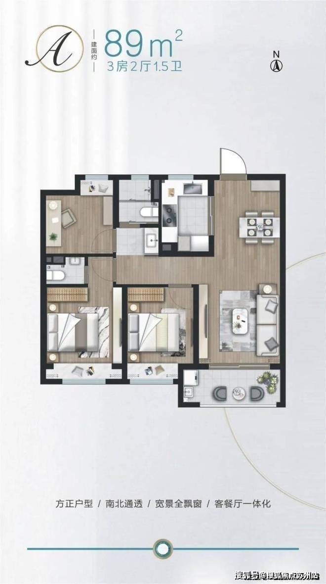 锦绣澜湾售楼处营销中心:400-8828-814锦绣澜湾售楼处电话/地址☎:400-882-8814(开发商热线)建面约89㎡3房,户型方正,三开间朝南。餐客厅一体,连通阳台,采光通风俱佳。全卧飘窗,主卧套房设计,提升了舒适度。1.5卫设计更加人性化,便于使用。