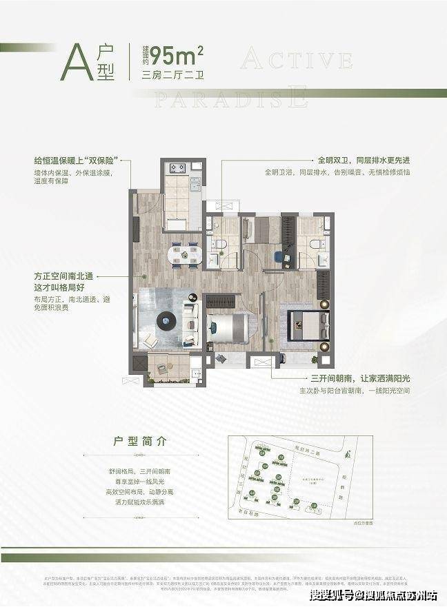 1、约95㎡的三房,南北通透,全明设计,三开间朝南,户型方正.