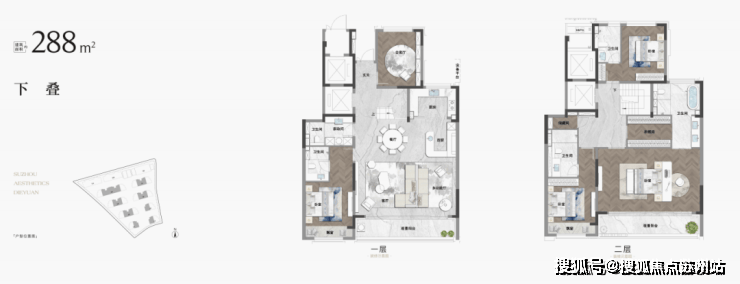 下叠拥有超大庭院,上叠有星空露台,且尺寸极大。横向巨幕开间,每一层单独拎出来都看比一套大平层。
