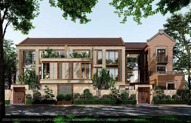 项目将清砖立柱、古典门头、岩石山墙等经典海派建筑风貌转译和突破,大窗墙比大南向开间、大面积运用奢石的外立面,带来了城心难得的双拼、三拼别墅!