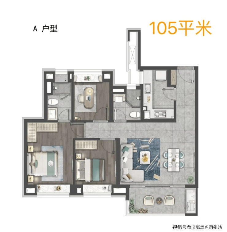 以99㎡三房两厅两卫户型为例,客餐厅连接景观阳台,采光面更大,为日常生活带来更多舒适感,双卫设计更为生活增添便利.105㎡三房两厅两卫户型,客餐厅与阳台一脉相连,居住空间感进一步扩大,约5.1米的宽厅,无论是日常休憩还是会客,都尽显大方得体.此外,项目中央空调、地暖、新风三大件配套齐全,且臻选大金等同级品牌空调地暖、老板和方太等同级品牌厨房配备、摩恩、弗兰卡、科勒等同级品牌卫浴配备,每一处细节都彰显着对居者的用心,为您打造高品质的居住环境.