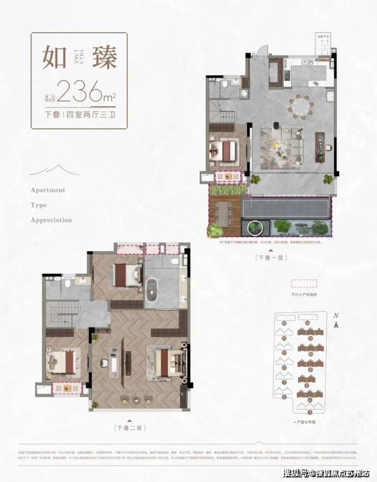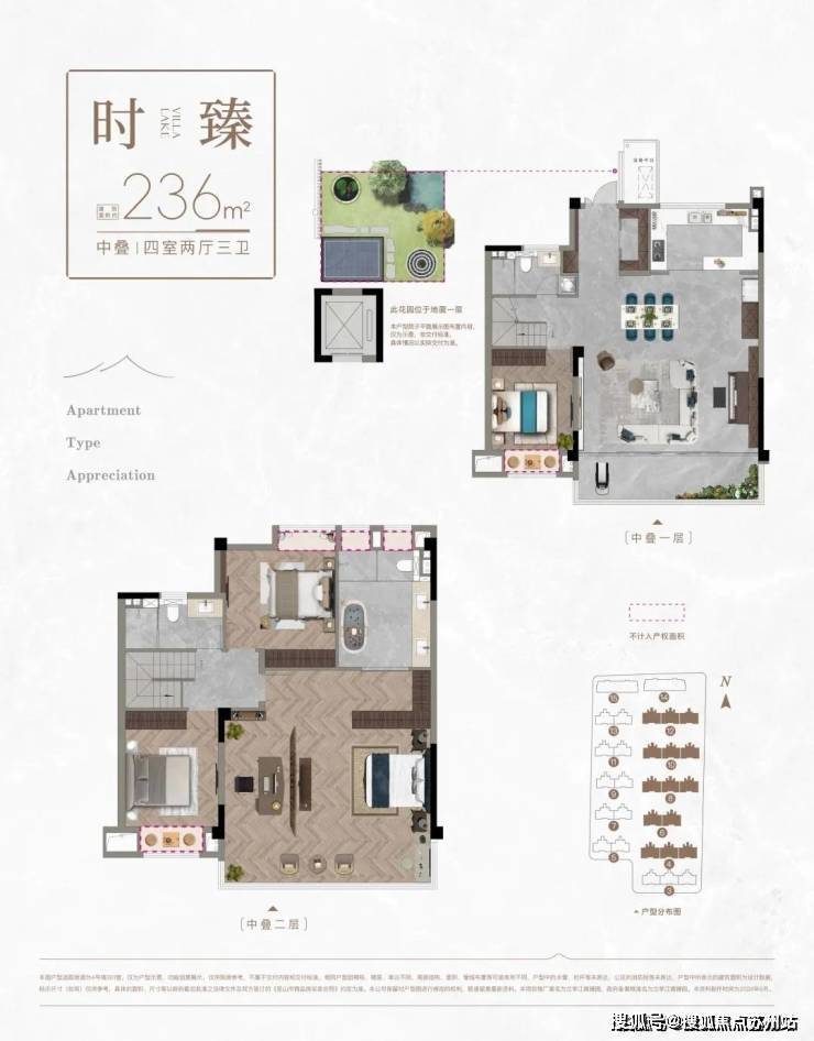 (4#6#8#10#12#大叠)中下叠建面:236平,四房两厅三卫(大叠送南向花园35平,中叠送北向花园15平)