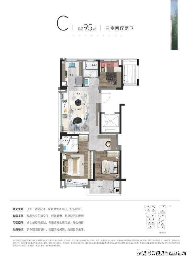 一体化的定制空间:将精致的生活理念,贯穿于建筑、景观、室内等各个组成部分.户型空间的一体化定制,以厅厨为核心的公共空间强调空间的可塑性,呈现更多愉悦、舒适、优雅的生活真意.