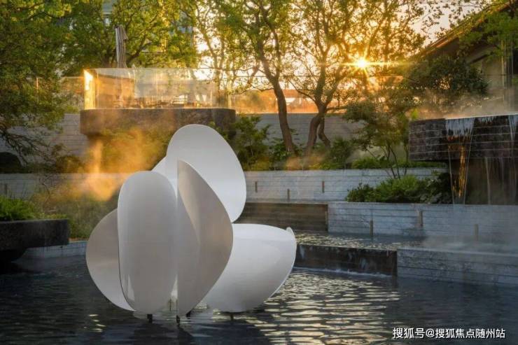 漫步知海棠示范区,从大门入口开始,空间序列徐徐展开,穿过超52米跨度的回字形布局大门,沿着台地住区缓缓而上,“西湖十景”灵感的立体山水之境渐次展开,形成拾级而上、步步生景的沉浸式体验,仿佛置身一座悬浮于空中的绿洲,每一步都是风景,每一眼皆为诗意。