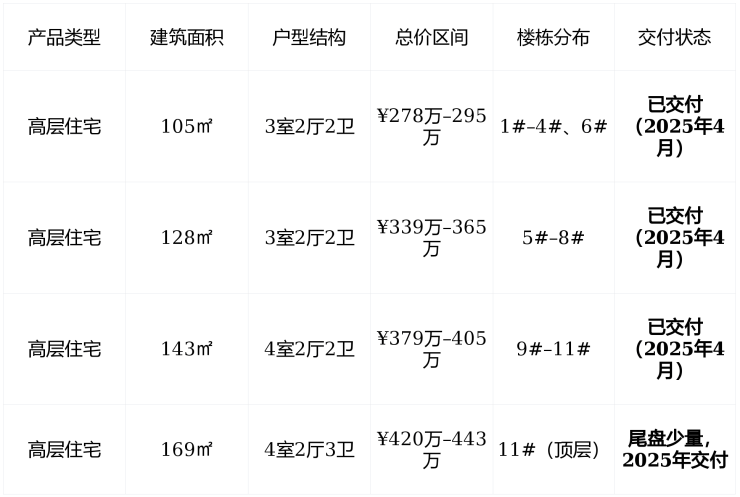剩余房源:截至2026年1月,105㎡户型基本售罄,128㎡余量不足10套,143㎡及169㎡仍有尾盘可选,二期预计2027年3月开盘,暂无预售信息