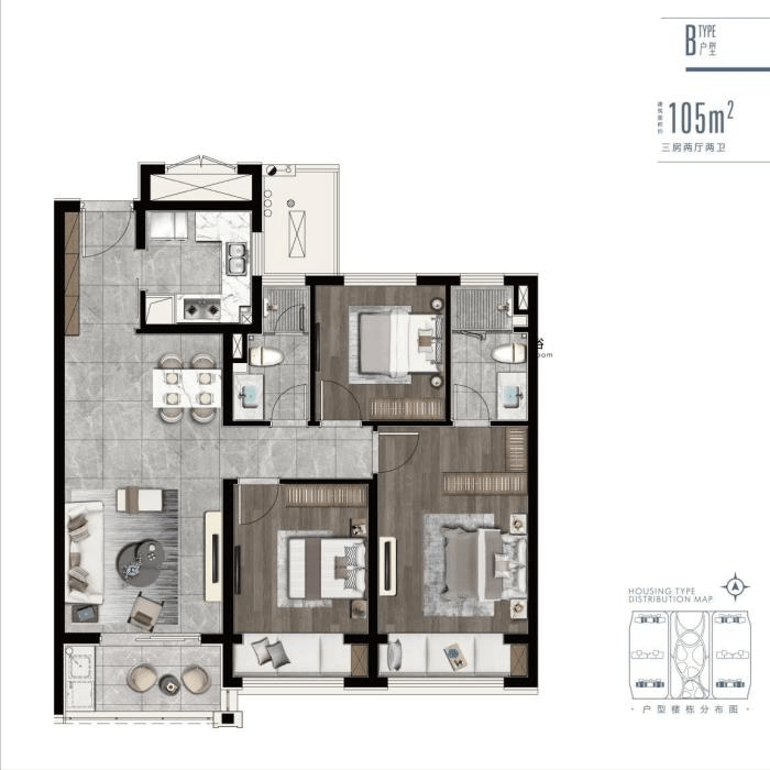 约105㎡三房两卫:经典实用户型,三开间朝南,阳光充足。客厅餐厅连在一起很宽敞,直通阳台。主卧是带独立卫生间的套房,私密性好。两个卧室还带飘窗,好看又实用。