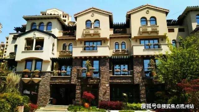 【同润•蓝美俊庭】采用南加州的建筑风格,外立面采用文化石和暖黄色涂料,搭配红色的筒瓦、烟囱、铁艺栏杆等建筑,尽现南加州原乡风情。