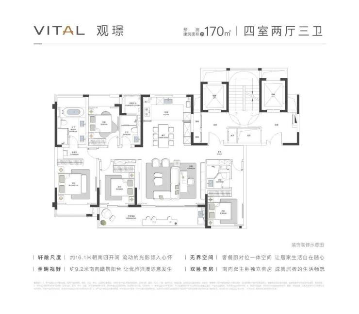 项目主打纯粹改善,只有三种大户型。约170㎡的“观璟”户型,格局方正,功能齐全;约197㎡的“怀璟”户型,空间阔绰,居住体验升级;约230㎡的“心璟”户型,堪称终极改善之选,尽享大平层的从容与气度。每一种户型,都旨在为家庭提供更宽敞、更舒适的居住体验。
