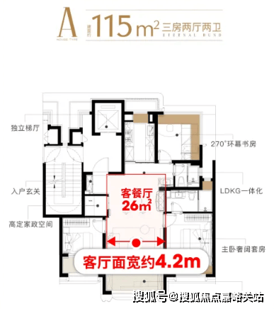 这样的设计支撑起了约26㎡的巨幕通厅,约4.2米的南向客厅开间。这样的设计,远超同面积段的常规水平,搭配全景落地窗与南向阳台,空间通透感直接拉满。餐厅区域更是能轻松放下6人圆桌,让餐厅从单纯的“吃饭区域”,升级为家庭核心社交厅。