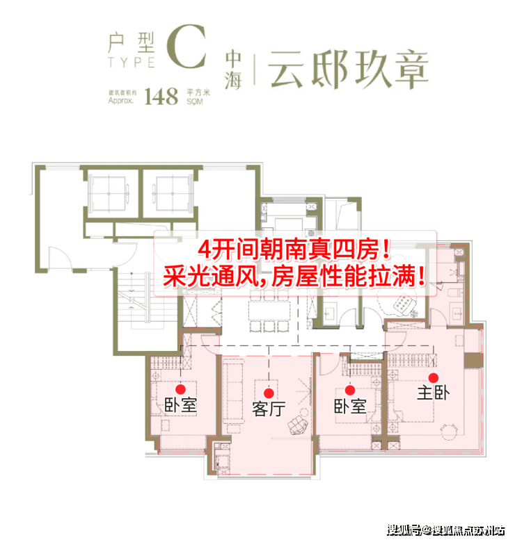 阔绰的南向面宽向来是中海户型的卖点,没想到在建面约148㎡户型上直接做到了四开间朝南,奢侈的南向开间让业主起居之间沐浴充足阳光!