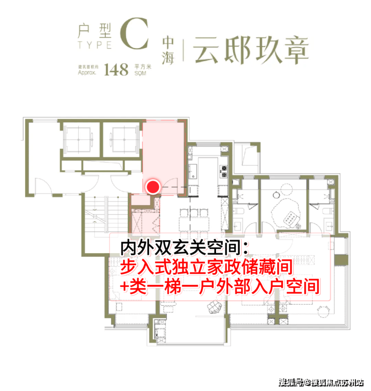 项目建面约148㎡4房户型享类1梯1户,全明电梯厅设计,不仅仪式感拉满,而且将近10㎡的电梯厅空间也能成为业主家的延伸,配合门内玄关形成内外双玄关格局,未来可以打造一个步入式家庭储藏间!