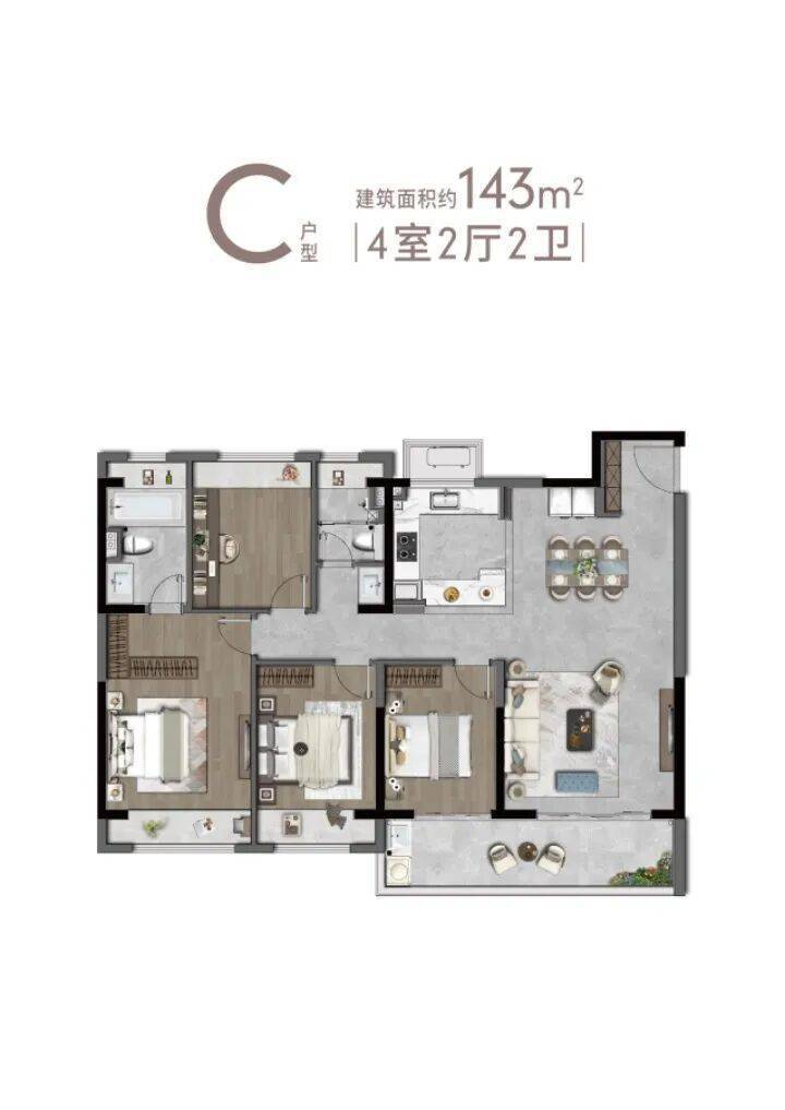 143㎡四室两厅两卫约379万约2.65万元/㎡中西双厨设计,餐厅可容纳10人圆桌