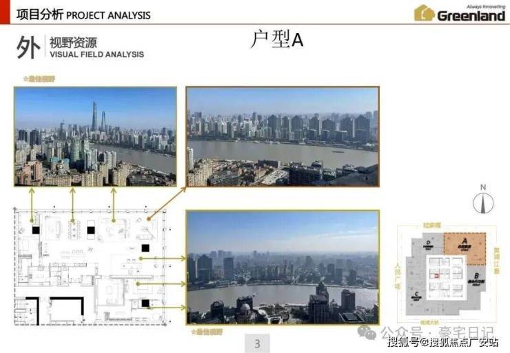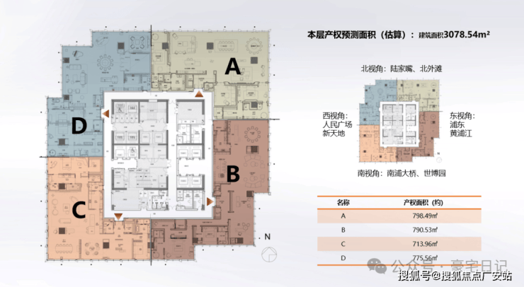 本案北视角:陆家嘴、北外滩;西视角:人民广场、新天地;东视角:浦东、黄浦江;南视角:南浦大桥、世博园.