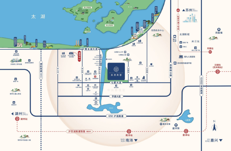 吴溇尚都的位置堪称“王炸”。它坐落在风景如画的七都镇吴溇核心,出门大约1公里就能走到太湖南岸,散步看湖景非常方便。同时,它又紧邻镇府,属于真正的镇中心地段,生活便利性和未来潜力都有保障。对于寻求太湖边置业的购房者而言,这里是难得的兼具自然与繁华的优质地段。