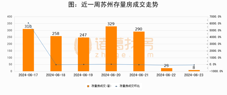 从存量房来看,2024年06月23日苏州存量房单日成交8套,比昨日减少15套,环比下降65.2%。从近一周存量房成交来看,苏州存量房日均成交套数为209套,06月23日单日成交8套,低于近一周平均水平96.2%。