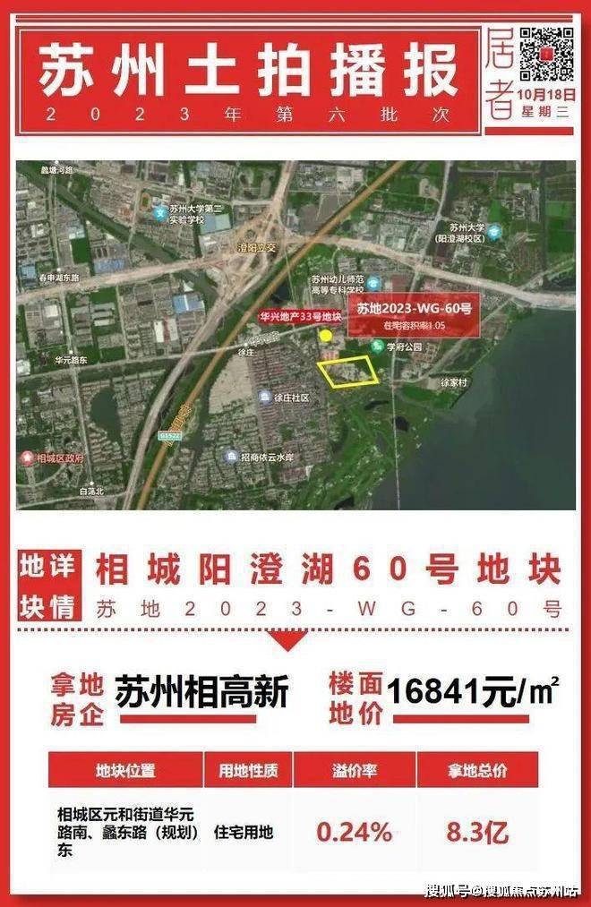 相城阳澄湖60号地块,在2023年10月被苏州相高新拿下 ,楼面地价16841元/㎡,溢价率0.24%,总价约8.3亿。