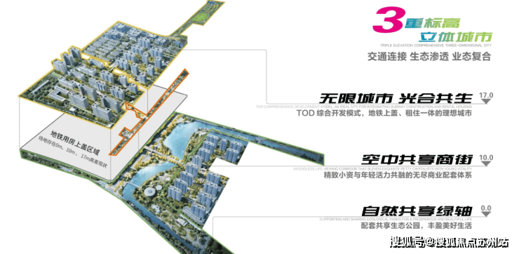 二度标高10m:配有生活服务配套,商业、公园、办公。1万㎡精致生活配套、盖上商业文化、体育文化、养老医疗、行政管理健康四轴。