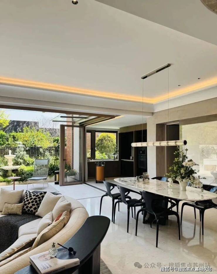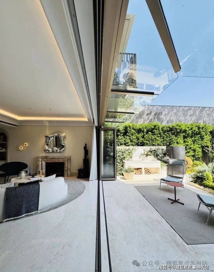 「无界空间」:客厅270度转角无柱设计,搭配落地玻璃,开阔视野将院中风景迎入日常.