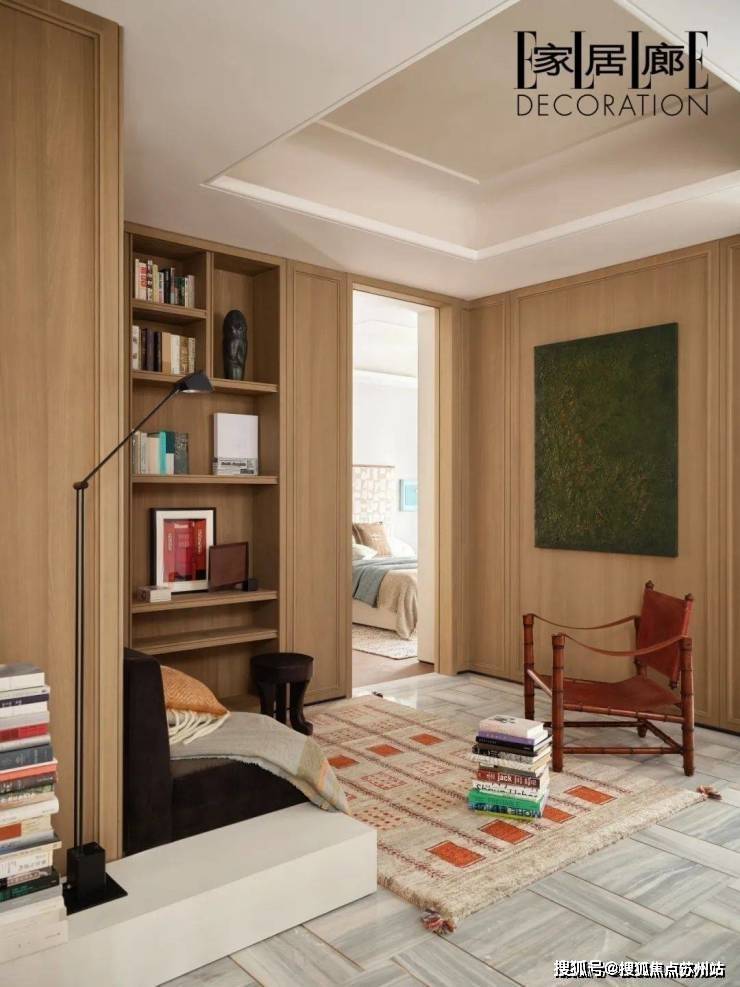 连廊视线直达的一侧是兼具了书房与化妆间功能的休闲室,这里成为联通卧室的另一个纽道。艺术化的软装配饰将视觉定格,让来者不自觉停下脚步细看。空间中单品的存在有依可据,绳结式样的吊灯是艺术家用旅行中带回来的纱线材质重新定制的产品,生活的样貌由各种经历构成,那么物件的来源自然也应该属于生活一部分。