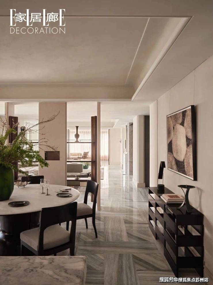 入户的一刻,空间的视觉体验从一个以小型圆桌为焦点的副厅开始。设计团队有意介入黄金十字轴的布局方法,对空间的界限进行模糊和延展处理,最大程度地释放尺度,强调仪式感的同时,制造和引导动线的洄游,让空间相互渗透,形成多义的生活形态。