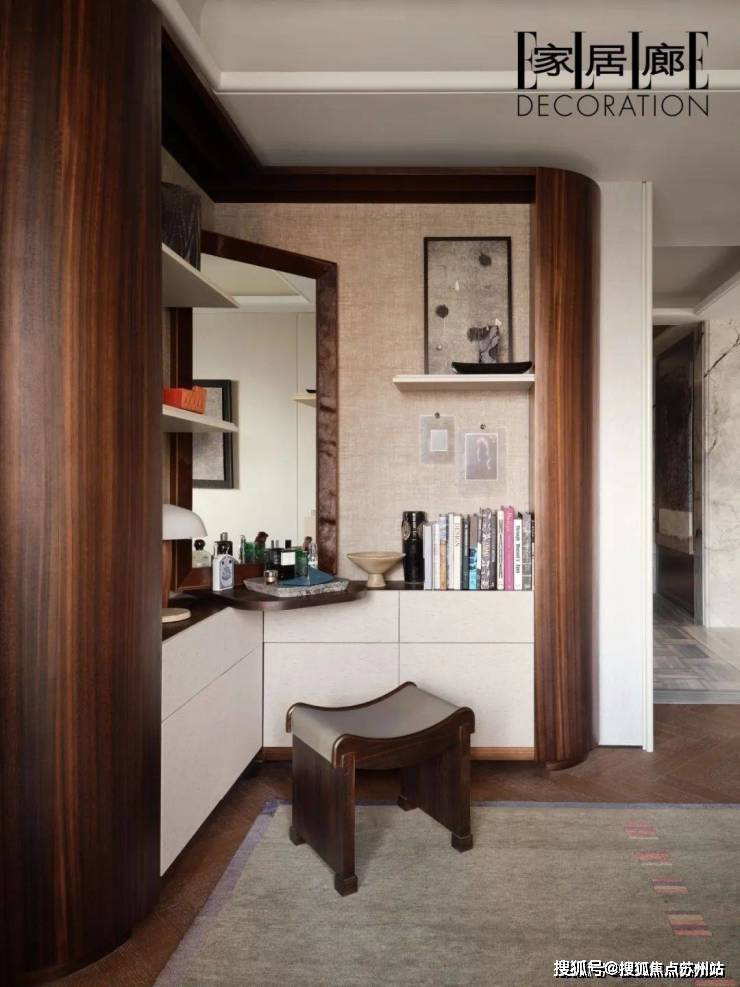 休闲室尺度相对较小,斜角的梳妆台镜面设计拓宽了视野的局限,空间中的挂画,同样也以视觉体验作为考量进行搭配。当伴侣在一侧饮茶、阅读,感受晨光时,自己则在对角的书(梳)妆台整理晨容,化妆镜的存在,也带动了家人之间微妙的互动。