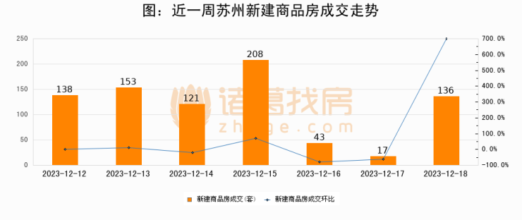 根据苏州市房地产市场和交易管理中心数据显示,2023年12月18日苏州新建商品房成交136套,较昨日增加119套,环比上涨700%。近一周苏州新建商品房日均成交117套。12月18日单日成交136套,高于近一周平均水平16.2%。