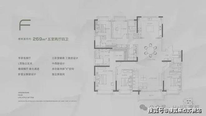 综合评价:269㎡五房,因为面积够大,做5房各个空间尺度也依然很舒适;三间套房,配置非常不错,独立玄关、超大厨房、独立家政间,各方面配置都非常不错,面积达到一定程度,户型怎么做都不会太差